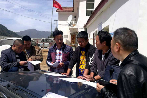 甘凯杰带领村两委研究扶贫项目施工技术指标